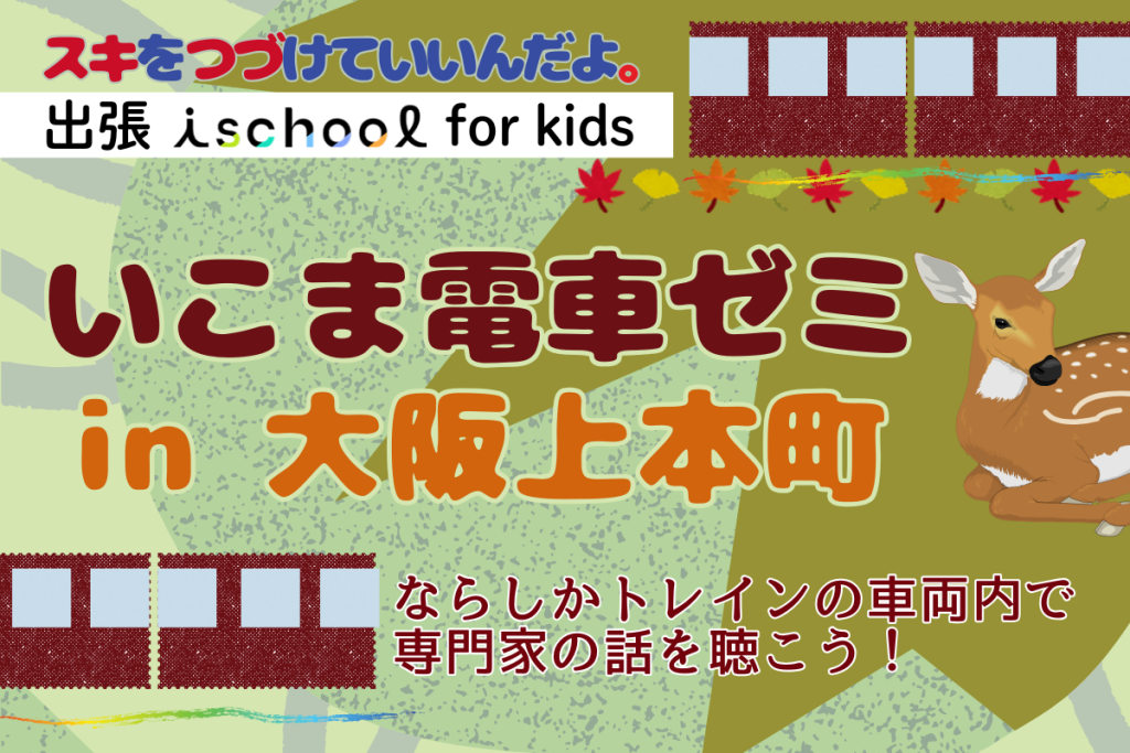 11月15日(土)開催の出張ischool for kids スキつづ。「いこま電車ゼミin大阪上本町~ならしかトレインの車両内で専門家の話を聴こう!」にまだ若干の空きがございますので、よろしければ併せてお申込みください。